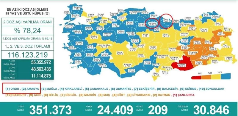 Son açıklanan en az 2 doz aşı olmuş 18 yaş ve üstü nüfus yüzdesine göre Karadeniz Bölgesi’nde en çok aşılama yüzde 82,6 ile Ordu’da yapıldı. Ordu’yu takip eden Amasya yüzde 82,3 aşılama oranı ile 2. sırada yer aldı. Yüzde 80,3 aşılama oranına sahip olan Zonguldak 3. sırada yer alırken, yüzde 80 aşılama oranına sahip olan Bartın 4. sırada yer aldı. Beşinci sırada yer alan Giresun’da aşılama oranı yüzde 79,8 oldu. Yüzde 79,2 aşılama oranına sahip olan Artvin altıncı sırada yer alırken, yüzde 79,1 oranına sahip olan Sinop 7. sırada yer aldı. Yüzde 78,9 ile Çorum sekizinci, yüzde 77,6 ile Kastamonu dokuzuncu ve yüzde 77,4 ile Samsun onuncu sırada yer aldı. 11. sırada yer alan Bolu’da aşılama oranı yüzde 76,4 olurken, on ikinci sıradaki Tokat’ta yüzde 76,2, on üçüncü sıradaki Trabzon’da yüzde 75,9, on dördüncü sıradaki Rize’de yüzde 74,6, on beşinci sıradaki Karabük’te yüzde 73,4, on altıncı sıradaki Düzce’de yüzde 71,3, on yedinci sıradaki Gümüşhane’de yüzde 67,8 ve on sekizinci sıradaki Bayburt’taki aşılama oranı yüzde 64 oldu.
