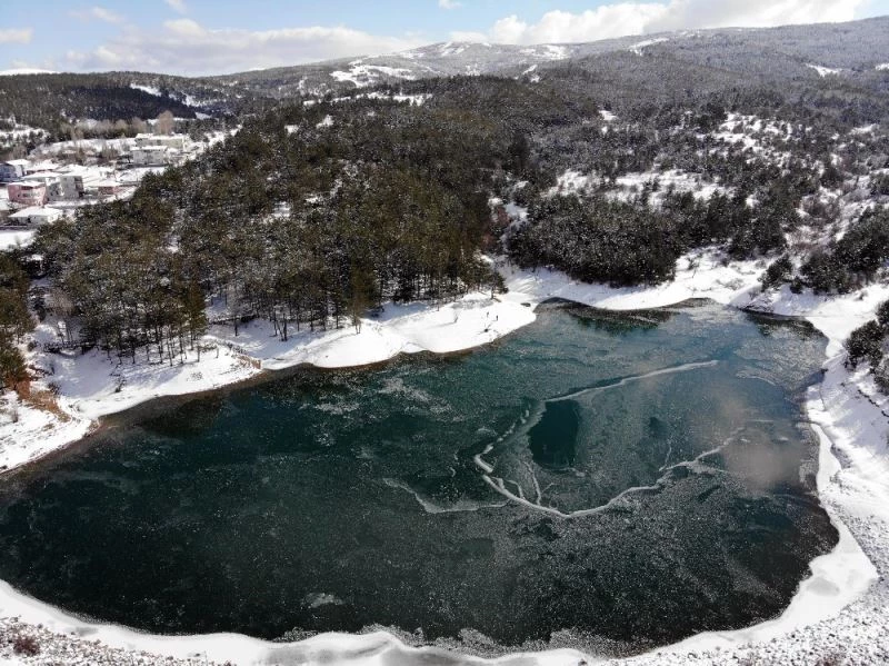 Türkiye’nin ilk milli parkı olan Yozgat Çamlığı Milli Parkı içerisinde bulunan Cevdet Dündar Göleti tamamen buz tuttu. Karla kaplanan orman ve göletin bütünleşmesi havadan görüntülendi.