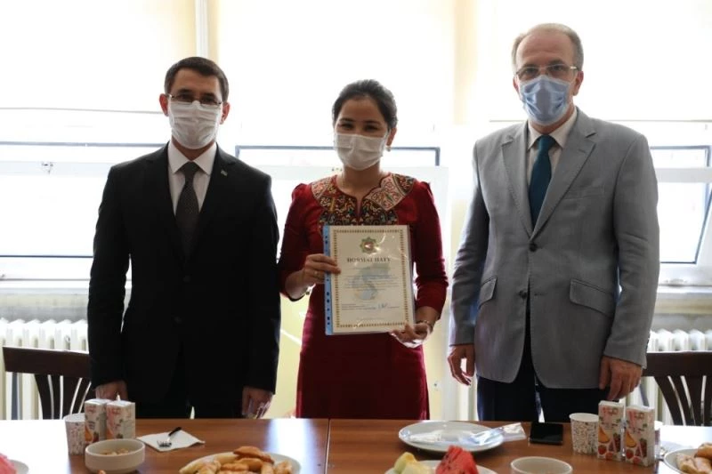 Büyükelçi Amanlıyev ile Rektör Uzun, Türkmenistan Tarafsızlık Ülkesi adına düzenlenen etkinliklere katılımı ve özverisi dolayısıyla Bartın Üniversitesi Fen Fakültesi Moleküler Biyoloji ve Genetik Bölümü 4. sınıf öğrencisi Jahan Berdyyev’e onur belgesi verdi.