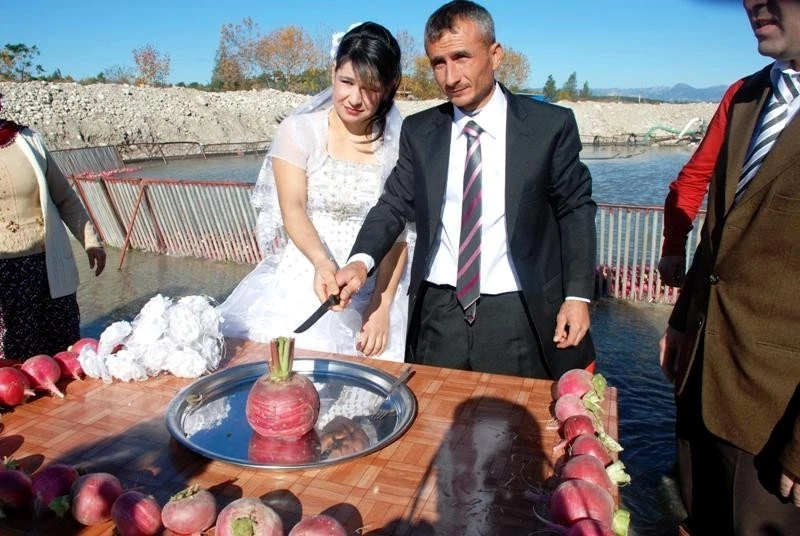 Osmaniye?nin Kadirli ilçesinde turp temizleme işinde çalışan işçiler düğünlerini turp havuzunda yaptı. Geline para yerine turp takıldı, düğün pastası yerine turp kesildi. Bu ilginç düğün Savrun çayı içerisinde turp yıkamak için kurulan havuzda gerçekleşti. Mehmet (30) ve Tuna (20) Ağbilmez çiftleri düğünlerini turp yıkarken tanıştıkları turp havuzunda yaptı. Maddi durumları iyi olmadığı için çiftin düğün masrafları Yasdıoğlu Metro Market sahibi Kasım Yasdıoğlu tarafından karşılandı. Düğünün yapılacağı turp havuzuna turplarla süslenmiş traktörle gelen gelin ile damat, burada davetliler tarafından alkışlarla karşılandı. Davul ile zurna eşliğinde turp havuzuna giren çiftler, turpların arasında dans etti. Havuza davet edilen gelin ile damadın mesai arkadaşları ise su içerisinde oyun oynayarak düğüne renk kattı. Düğünde para yerine turp atıldı. Balon yerine turplarla süslenen düğün yerinde çiftlerin keseceği düğün pastası ise yine bir turp oldu. Ağbilmez çiftti masa üzerinde gelen turpu bıçakla keserek birbirlerine yedirdi. Hayallerinin gerçek olduğuna çok sevindiğini söyleyen gelin Tuna Ağbilmez, ?Eşimle turp havuzunda tanıştık, burada evleniyoruz. Çok mutluyum.? dedi. Turp gibi bir gelin aldığını söyleyen damat ise ?Turp işçisiyiz, turp bizim geçim kaynağımız. Düğünümüzü bile burada yapıyoruz. Çok mutluyum Allah herkese nasip etsin.? diye konuştu.