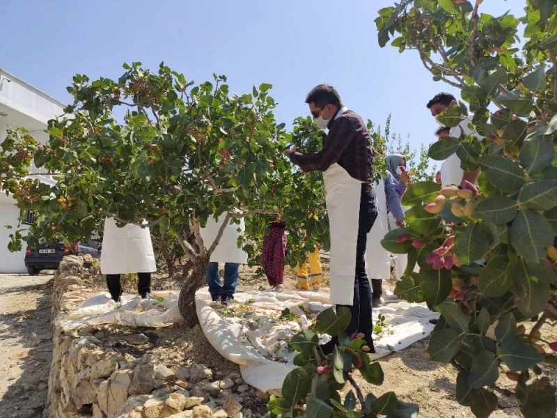 Adıyaman’ın Tut Kaymakamı Muhammet Tugay, köy gezileri kapsamında gittiği Yalankoz’da fıstık hasadına katıldı.