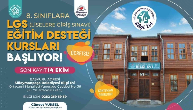 Süleymanpaşa Belediyesi tarafından, 8’inci sınıf öğrencilerine yönelik Liselere Giriş Sınavı (LGS) Eğitim Desteği Kursları başlıyor. Kayıtlar için son gün 14 Ekim.