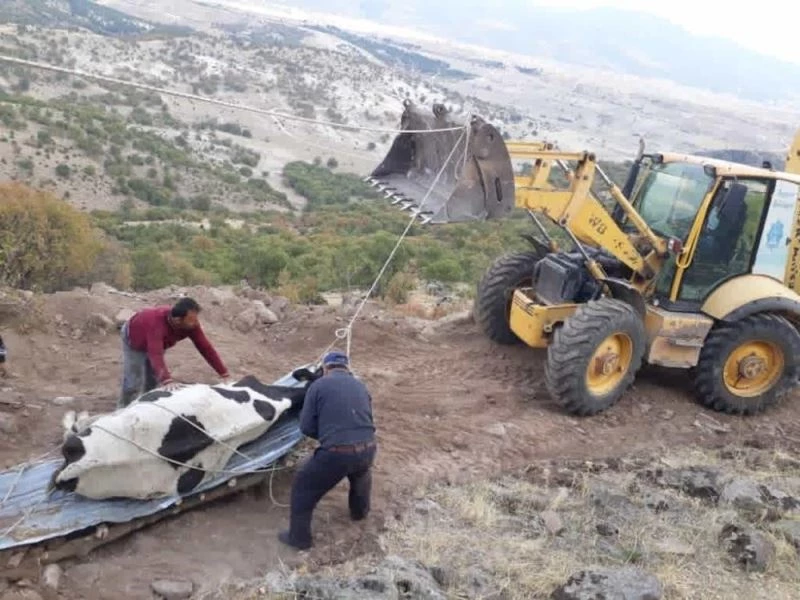 Konya’nın Beyşehir ilçesinde, yaklaşık 4 metre yükseklikteki uçurumdan aşağı kayalık bölgeye düşen ve gebe olduğu belirtilen inek, iş makinesi yardımıyla kurtarıldı.