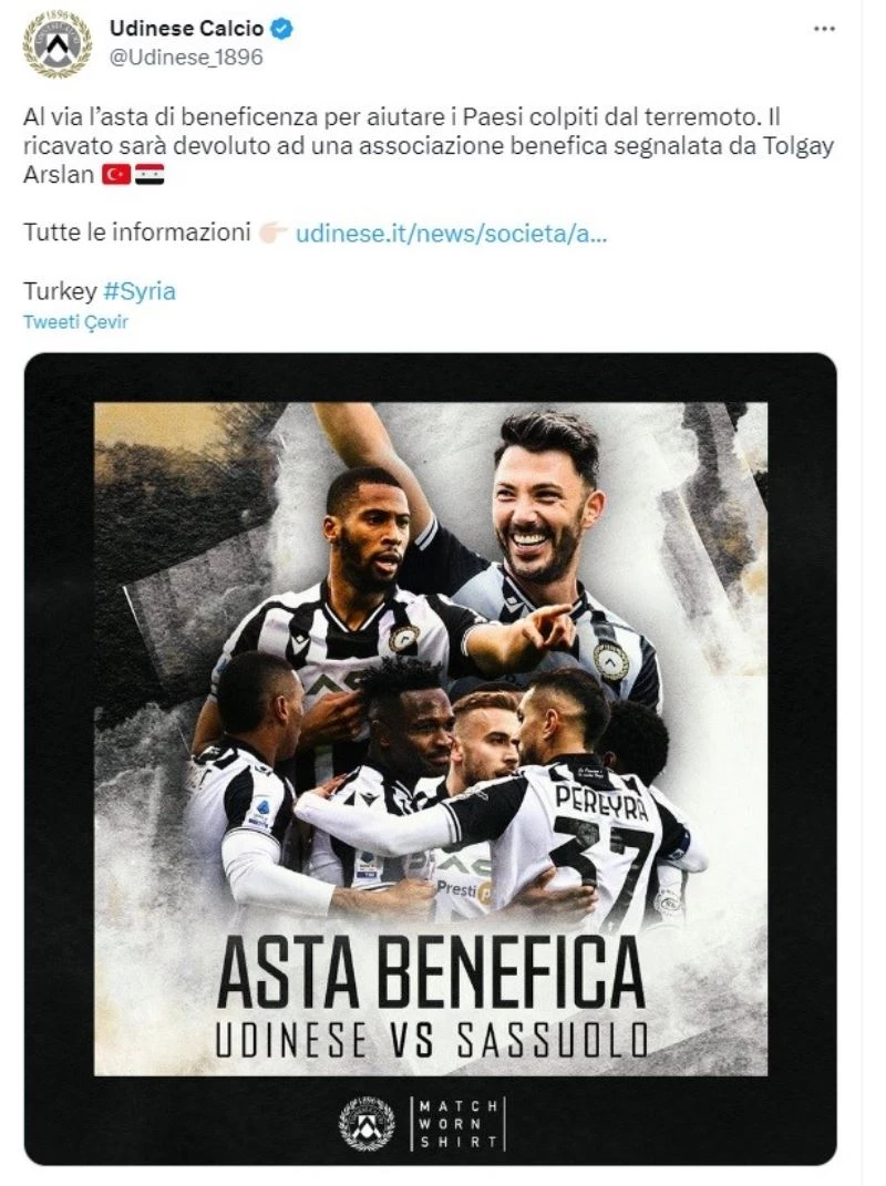 Kahramanmaraş merkezli meydana gelen ve 10 ili etkileyen depremlerde zarar gören vatandaşlara ulusal ve uluslararası yardımlar gelmeye devam ediyor. Tolgay Arslan’ın formasını giydiği İtalyan temsilcisi Udinese de Türkiye ve Suriye’deki depremzedeler için dün Sassuolo ile oynanan müsabakada futbolcularının giydiği ve sonrasında imzaladığı formaları açık artırmayla satışa çıkardı. 18 Şubat Cumartesi günü saat 15.00’e kadar sürecek satışta elde edilen gelirler bir yardım vakfına bağışlanacak.
