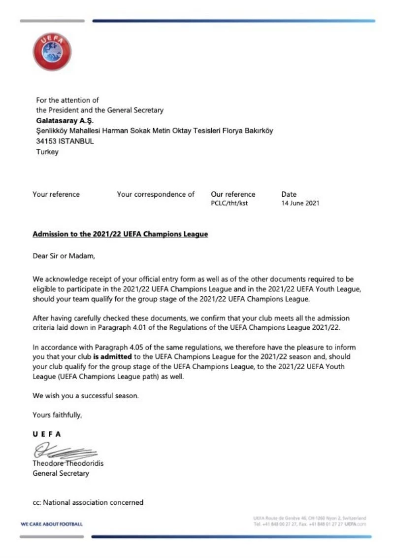 Galatasaray’ın resmi internet sitesinden konuyla ilgili yapılan açıklamada, UEFA Genel Sekreteri Theodore Theodoridis’in imzasıyla gönderilen bilgilendirme mektubunda; sarı-kırmızılıların 2021-2022 sezonu UEFA Şampiyonlar Ligi ve 2021-2022 sezonu UEFA Gençlik Ligi’ne katılım için gerekli tüm yükümlülükleri yerine getirdiği belirtilerek, "Takımınız, 2021/22 sezonu grup aşamasına katılmaya hak kazanırsa, 2021/22 UEFA Şampiyonlar Ligi ve 2021/22 UEFA Gençlik Ligi için resmi katılım formunuzu ve gerekli olan diğer belgelerin alındığını bildiririz. Bu belgelerin dikkatli bir şekilde incelenmesinin ardından, Kulübünüzün 2021/22 UEFA Şampiyonlar Ligi Yükümlülüklerinin 4.01 Paragrafına göre, tüm kriterleri yerine getirmiş olduğunu onaylarız. Aynı Yükümlülüklerin 4.05. Paragrafına uygun olarak, Kulübünüz UEFA Şampiyonlar Ligi Grup Aşamasına katılmaya hak kazanırsa, 2021/22 UEFA Şampiyonlar Ligi’ne ve dolayısıyla 2021/22 UEFA Gençlik Ligi’ne kabul edildiğini bildirmekten memnuniyet duyuyoruz. Sizlere başarılı bir sezon dileriz" denildi.