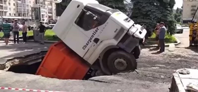 Ukrayna’daki Jitomir şehrinde belediye ekipleri tarafından sürdürülen asfalt çalışması sırasında malzeme taşıyan bir kamyon yolun çökmesi sonucu oluşan çukura düştü. Meydana gelen olay sonrasında çukura düşen kamyon uzun uğraşlar sonucunda çıkarıldı. Olayın ardından Ukrayna’daki yolların bakımsızlığı sosyal medyada bir kez daha ülke gündemine geldi.