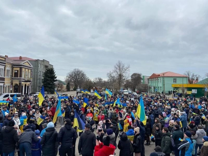 Rusya’nın Ukrayna’yı işgaline karşı çıkan yüzlerce Ukraynalı, Herson’da Rus ordusunu protesto etti.