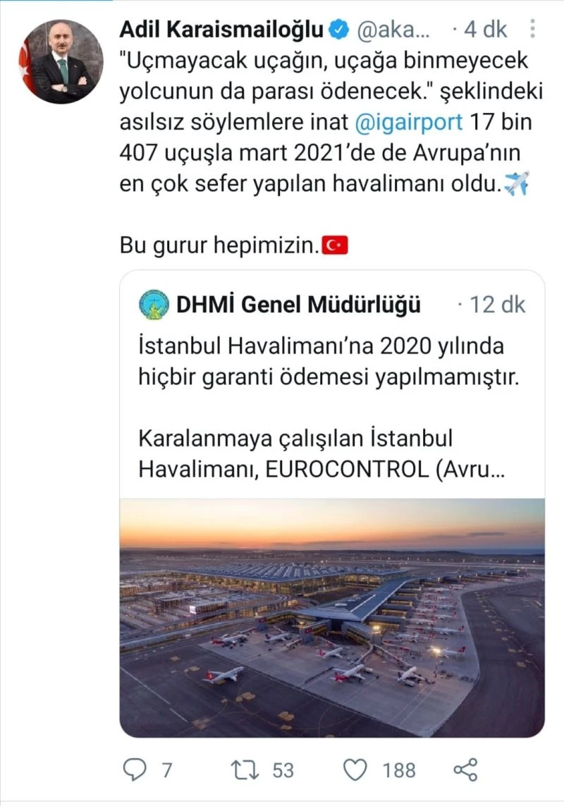 Konuya ilişkin sosyal medya hesabı Twitter’dan bir paylaşımda bulunan Ulaştırma ve Altyapı Bakanı Adil Karaismailoğlu, İstanbul Havalimanı’nın pandemi dönemindeki performansına dikkat çekerek, "’Uçmayacak uçağın, uçağa binmeyecek yolcunun da parası ödenecek.’’ şeklindeki asılsız söylemlere inat @igairport 17 bin 407 uçuşla Mart 2021’de de Avrupa’nın en çok sefer yapılan havalimanı oldu. Bu gurur hepimizin" değerlendirmesinde bulundu.