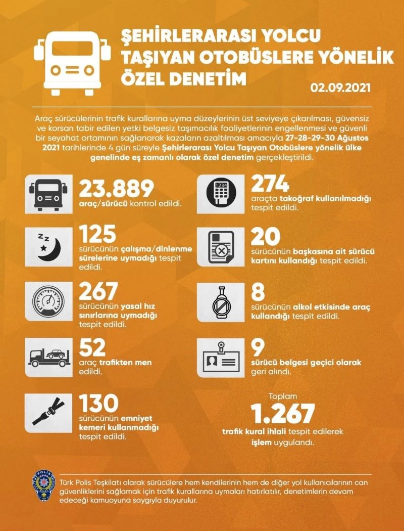 Emniyet Genel Müdürlüğü, trafikte güvenli yolculuğun sağlanması, kural ihlallerinin önüne geçilmesi ve yasadışı taşımacılık faaliyetlerinin önlenmesi amacıyla 27-30 Ağustos tarihleri arasında yurt genelinde Şehirlerarası Yolcu Taşıyan Otobüslere yönelik eş zamanlı denetim gerçekleştirildiğini duyurdu.