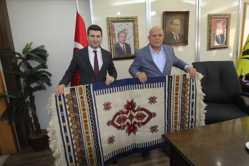 Belediye Başkanı Hükmü Pekmezci, Ülkü Ocakları Genel Başkanı Ahmet Yiğit Yıldırım’a ziyaret anısına Dede Korkut Biblosu, Aydıntepe Kabarma Halı ve çeşitli hediyeler verdi.