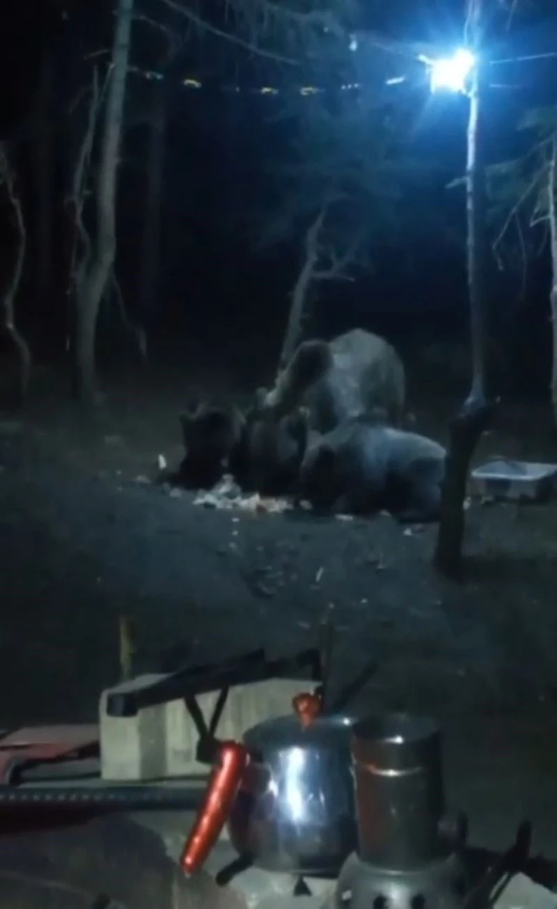 Uludağ’da ormandan yerleşim yeri olarak bilinen Sarıalan Bölgesi’ne gelen anne ayı ve 3 yavrusu; kendileri için bırakılan ekmekleri ve yemekleri yerken görüntülendi. Bir kampçı tarafından görüntülenen ayılar, kaptan su içiyor ve iştahla yemekleri yiyor.