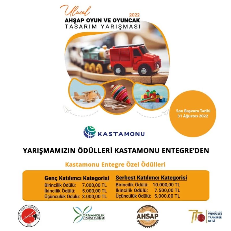 “Ormancılık ve Tabiat Turizmi” alanında ihtisaslaşan Kastamonu Üniversitesi’nde gerçekleştirilecek olan Ulusal Ahşap Oyun ve Oyuncak Tasarım Yarışması, 3 yaş üzeri çocukların oyun ve eğlence ihtiyaçlarını karşılayabilecek ahşap oyun materyallerinin çeşitliliğini arttıracak. Yarışmada çocukların el-göz koordinasyonu ve kas gelişimine uygun, eğitim ortamlarını destekleyici, eğlenerek öğrenmeye teşvik eden oyun ve oyuncakların, doğal, sağlığa uygun, sürdürülebilir, çevre dostu ahşap malzemelerden tasarlanıp üretilmesi, ahşap oyun ve oyuncak çeşitliliğinin arttırılması ve kullanımlarının benimsenerek yaygınlaştırılması amaçlanıyor.