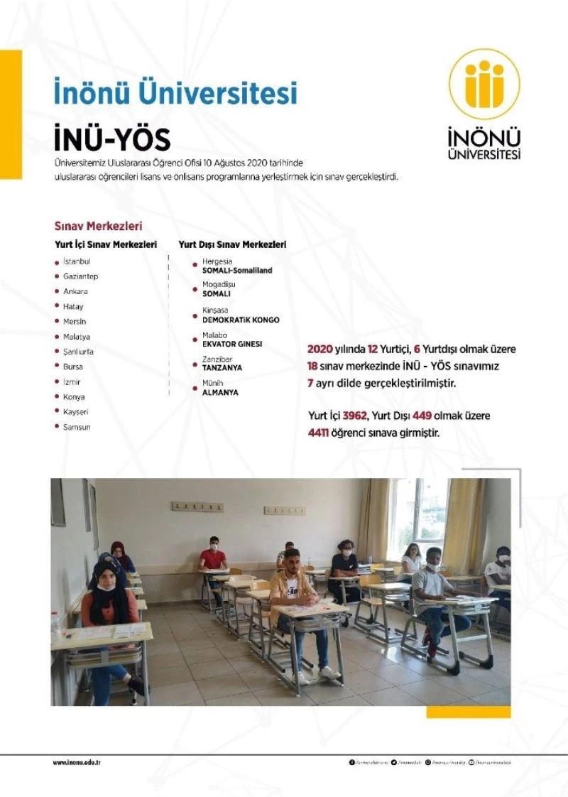 İnönü Üniversitesi’ne uluslararası lisans ve ön lisans programlarına yerleştirmek için 12 yurt içi ve 6 da yurt dışında olmak üzere 18 sınav merkezinde 7 ayrı dilde sınav gerçekleştirildi.