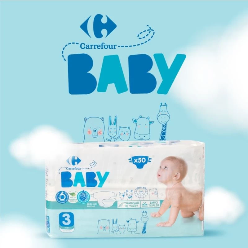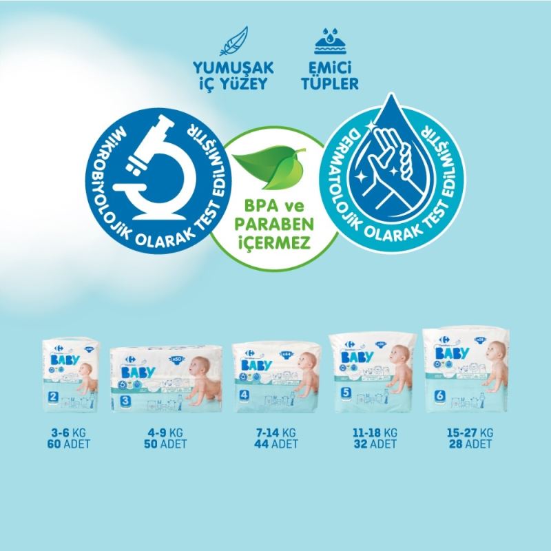 Bebekler için 2, 3, 4, 5 ve 6 numaralarda sunulan Carrefour Baby bebek bezi, uluslararası standartlar çerçevesinde CarrefourSA tarafından denetlenen tesislerde hijyenik bir ortamda üretilip mikrobiyolojik olarak test edildi.