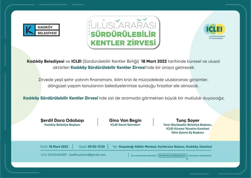 Kadıköy Belediye Başkanı Şerdil Dara Odabaşı, ICLEI Genel Sekreteri Gino Van Begin ve İzmir Büyükşehir Belediye Başkanı Tunç Soyer’in çağrısı ile toplanan Sürdürülebilir Kentler Zirvesi 18 Mart Cuma günü Kadıköy Kozyatağı Kültür Merkezi’nde yapılacak. ICLEI’nin şimdiye kadar Türkiye’deki en geniş kapsamlı etkinliği olan zirvede, yeşil şehir yatırım finansmanı, iklim krizi ile mücadelede uluslararası girişimler, döngüsel yaşam konularının belediyelere sunduğu fırsatlar ele alınacak. Sürdürülebilir Kentler Zirvesi’nin sonunda belediye başkanlarının imzalayacağı “Kadıköy Bildirgesi” açıklanacak.