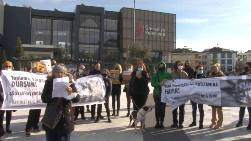 Ümraniye Belediye binası önünde toplanan hayvanseverler, sokak hayvanlarının korunmasına ve hayvanların sağlık işlemlerinin gerçekleştirilmesine yönelik sloganlar atarak basın açıklaması yaptı.