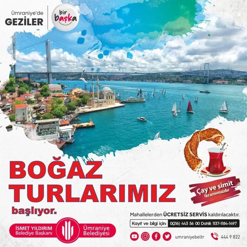 Ümraniye Belediyesi‚ İstanbul Boğazı’nın keyfini çıkarmak isteyen 7’den 70’e tüm ilçe sakinleri için ücretsiz boğaz turlarını yeniden başlatıyor. Katılımın yüksek olduğu turlarda vatandaşlar belediyenin ikramı olan simit ve çayları ile İstanbul Boğazı’nın muhteşem manzarasının keyfini çıkarıyor.