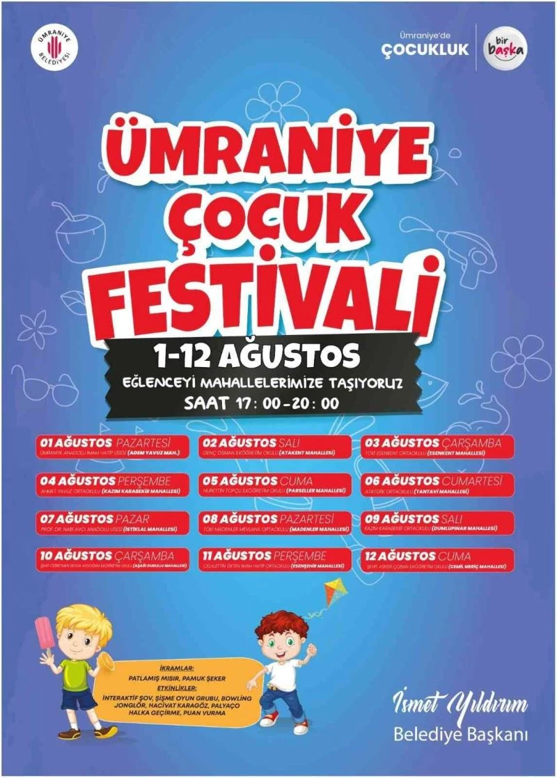 Tatilin vazgeçilmezi haline gelen "Ümraniye Çocuk Festivali" her gün bir mahallede saat 17.00’den 20.00’ye kadar kapılarını açık tutacak. Etkinlikler, 12 Ağustos Cuma günü sona erecek. Birbirinden renkli ve eğlenceli oyun gruplarıyla konuklar, heyecanlı bir atmosfer yaşamış olacak.