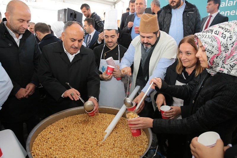 Başkan Hasan Can, ? 5 yıl önce aşure dağıtımlarına ilk olarak 10-15 kazan ile başladık. Artık 60 kazan civarında aşure kaynatarak, Ümraniye?mizin her köşesindeki insanımızın bu manevi iklimi yaşamasını arzu ediyoruz. Geçtiğimiz Cuma günü, Bosna- Hersek?te bulunan kardeş şehrimiz Fojnica?daki kültür merkezinde kaynattığımız aşuremizi, camide yapılan programın ardından akşam namazı sonrasında ikram ettiler. Buradan bir başkan yardımcısı arkadaşımızı, iki müdürümüzü ve gençlik kollarımızdan da iki kardeşimizi temsilci olarak Bosna?ya gönderdik. Bizim adımıza o programlara iştirak ettiler? dedi. Pazartesi günü yapılan programa da değinen Başkan Hasan Can, ?Sayın Başbakanımız Ahmet Davutoğlu Ümraniye?deydi. İMES?te sanayicilerle bir araya gelerek, buradaki esnafımızı ziyaret etmişti. Ardından da İMES Camii?nde öğle namazı sonrasında aşure ikramında bulunmuştu. Bizim iki kazan aşuremiz ise orada hazırdı. Zarif bir programdı. Sayın Başbakanımızın hoşuna giden bir program oldu. Çünkü kazanların birini açtığında aşurenin üzerinde nardan bir Türk Bayrağı vardı. Diğer bir kazanda ise, Ümraniye Belediyesi?nin logosu vardı? dedi.