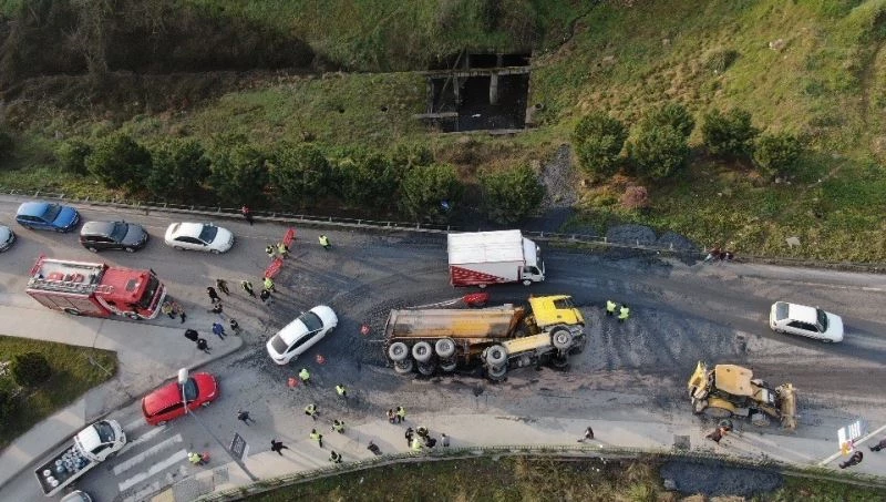 Olay, Ümraniye’de Tatlısu Mahallesi’nde TEM otoyolu yan yolunda Turgut Özal Bulvarında saat 08.00 sıralarında meydana geldi. Emin Kılıç idaresindeki 34 HJ 7192 plakalı beton yüklü kamyon aşırı yük nedeniyle virajı dönemeyerek yan yattı. Kamyonun devrilmesiyle sürücü yaralandı. Çevredeki sürücülerin ihbarı üzerine olay yerine polis, itfaiye ve acil servis ekipleri sevk edildi. Olay yerine gelen polis ekipleri güvenlik önlemi alırken, itfaiye ekipleri sürücüyü kurtararak acil servis ekiplerine teslim etti. Acil servis ekipleri yaralı sürücüye ilk müdahaleyi yaparak çevredeki Hastaneye kaldırdı. Kaza sonucu kamyonda bulunan beton yola savruldu, uzun araç kuyruğu oluştu. İş makineleri yardımıyla yolda bulunan beton temizlendi. Vinç yardımıyla devrilen kamyon kaldırılarak yol trafiğe açıldı. Sabah işe gitmek isteyen vatandaşlar kaza nedeniyle yaklaşık 1 saat trafikte kaldı. Öte yandan devrilen kamyon ve uzun araç kuyruğu havadan görüntülendi.