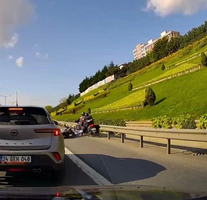 Ümraniye’de emniyet şeridinde seyreden 2 motosikletli, hatalı sollama yaparak kontrolsüz bir şekilde emniyet şeridine geçiş yapan başka bir motosiklet sürücüsüne çarptı. Çarpışma sonrası yola savrulan 2 motosikletliden biri yaralandı. Kaza, başka bir aracın araç içi kamerasına saniye saniye yansıdı.