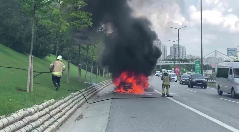 Ümraniye’de yol üzerinde ilerleyen otomobilinden dumanlar yükseldiğini fark eden sürücü aracını sağa çekerek indi. Alevler kısa sürede otomobili sardı. Alev alev yanan otomobili görenlerin ihbarı üzerine olay yerine itfaiye ekipleri sevk edildi. İtfaiye ekipleri yanan otomobile müdahale ederek söndürürken araçta maddi hasar meydana geldi. Otomobilin yandığı anlar ise cep telefonu kamerasına yansıdı.
