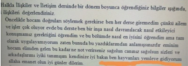 ‘Halkla İlişkiler ve İletişim dersinde bir dönem boyunca öğrendiğiniz bilgiler ışığında halkla ilişkileri değerlendiriniz’ sorusunu yanıtlayan öğrenci, “Öncelikle hocam doğruları söylemek gerekirse ben her derse giremedim. Çünkü ailem ve işler çok oluyor evde. Bu derste ben bir insana nasıl davranılacak, nasıl etkileyici konuşmamız gerektiğini öğrendim. Bu bölümde nasıl en iyisini öğrendim ama tam olarak uygulayamıyorum, zaten bunu da yazdıklarımdan anlamışsınızdır. Emimim hocam elimden gelen bu kadar. Ne not verirseniz sağ olun, canınız sağ olsun. Sizleri ve arkadaşlarımı iyi ki tanımışım kendinize iyi bakın. Ben hayvanları yemlemeye gidiyorum. Allah’a emanet olun iyi günler dilerim” diye yazdı.