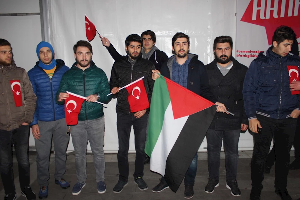 Osmaniye`de bir grup üniversiteli genç, ABD Başkanı Donald Trump`ın, Kudüs`ü İsrail`in başkenti olarak tanıma kararını oturma eylemi yaparak protesto etti. Ellerinde Türk ve Filistin bayraklarıyla Cumhuriyet Meydanı`nda toplanan öğrenciler, ABD`nin aldığı kararı protesto etmek amacıyla sabah namazına kadar oturma eylemi yaptı. Üniversite öğrencisi Mücahit Emre Yüksek, ABD Başkanı Donald Trump`ın açıklamasının ardından, alınan kararı protesto etmek için toplandıklarını ifade ederek, bundan dolayı yüreklerinin burkulduğunu ve yurtta duramayarak kendilerini dışarı attıklarını kaydettiler. Yüksek, "Biz, o kararı tanımıyoruz. Kudüs, hiç bir zaman siyonistlerin değildir. Kudüs, Müslümanların ortak davasıdır.Kudüs hiç kimseye peşkeş çekilemez. Amacımız burada bir duruş sergilemek. Kudüs Müslümanlarındır ve kimseye peşkeş çekilemez." dedi. Kudüs`ün 3 dinin ortak merkezi olduğunu vurgulayan Yüksek, "Ancak Kudüs bize Selahattin Eyyubi`nin, Osmanlının mirasıdır. Burada sabah namazına kadar oturacağız. Trump geri adım atana kadar tepkimizi sürdüreceğiz. Müslüman dik durur, biz de bu duruşumuzu herkese göstereceğiz." şeklinde konuştu.