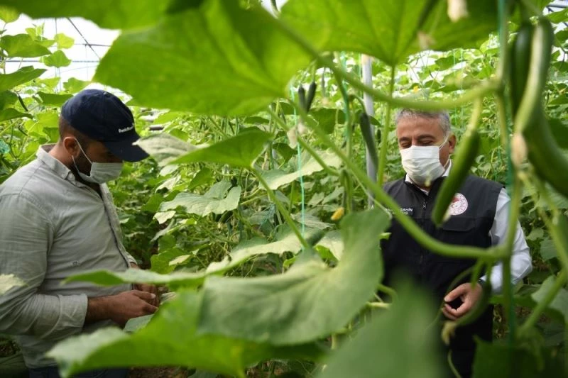 İl Tarım ve Orman Müdürü Mustafa Şahin, Kırsal Kalkınma ve Örgütlenme Şube Müdürü Mesut Erer ile birlikte Genç Çiftçi Projesinden faydalanan Oğuz Çiçek’e ait serada incelemelerde bulundu.