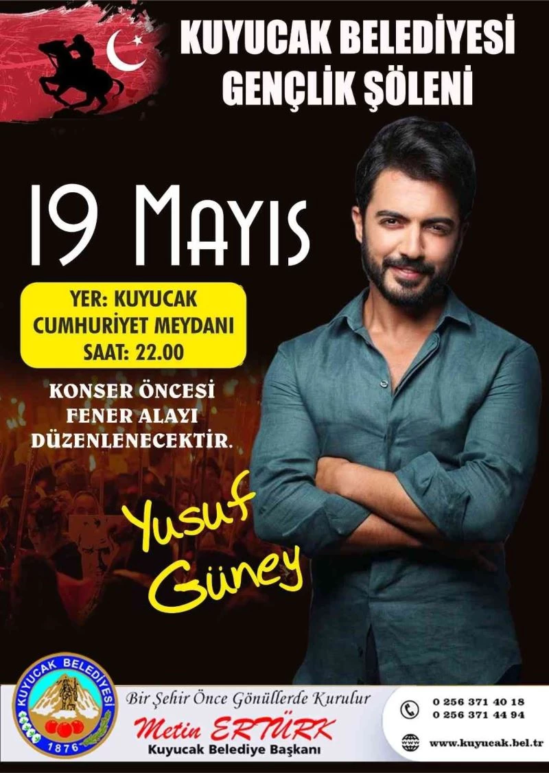 Kuyucak Belediyesi tarafından 19 Mayıs Atatürk’ü Anma, Gençlik ve Spor Bayramı dolayısıyla düzenlenecek olan Gençlik Şöleni’nde ünlü şarkıcı Yusuf Güney sahne alacak.