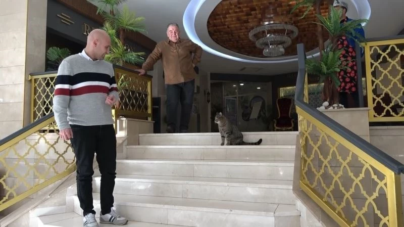 Kütahya’da bir müşteri tarafından unutulan kedi, Harlek Termal Otel’in adeta maskotu oldu.