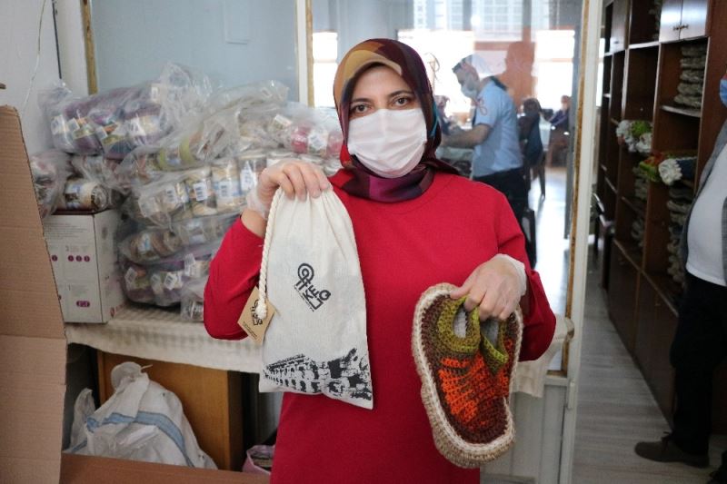 Kadınların bin bir emek ve gayretle ürettikleri ev ayakkabıları, 150 ila 200 lira arasında satışa sunuluyor.