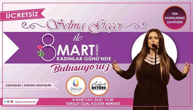 Kadınlara çeşitli hediyelerin verileceği çekilişin de yapılacağı program 8 Mart 2022 Salı günü saat 13:30’da Ürgüp Belediyesi Turgut Özal Kültür Merkezinde gerçekleştirilecek. Kadınlara yönelik programda TRT Sanatçısı Selma Geçer unutulmaz türküleriyle programa renk katacak.