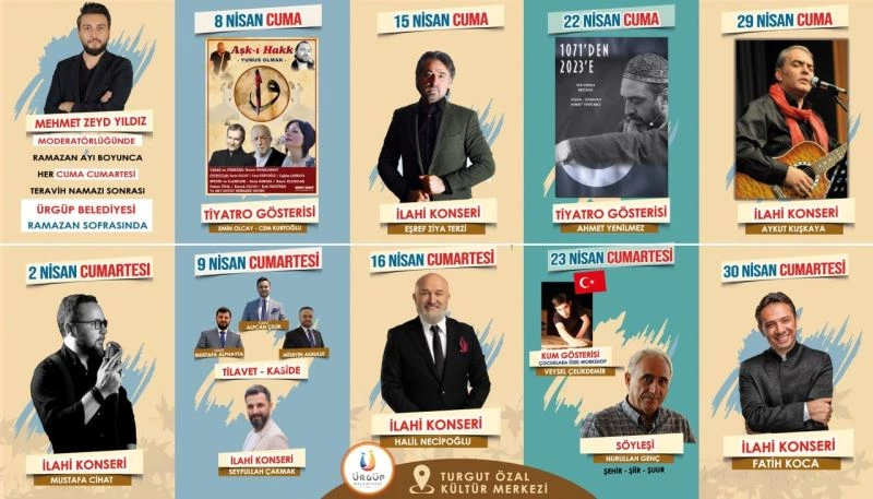 Turgut Özal Kültür merkezinde kurulacak ramazan sofrasında 2019 yılında olduğu gibi bu yıl da iftar yemeği ikram edilecek. Ürgüp Belediyesi Şehit Şenay Aybüke Yalçın Sosyal Tesisi tarafından hazırlanan iftar menüsüyle günlük 600 kişi aynı sofrada iftar yapacak. Ramazan boyunca her gün iftarla birlikte Ürgüp’ün yerel sanatçıları tarafından tasavvuf müziği dinletisi yapılacak. Cuma ve Cumartesi günleri teravih namazının ardından Ezgileriyle gönüllerde taht kuran sanatçılar Mustafa Cihat, Seyfullah Çakmak, Eşref Ziya Terzi, Halil Necipoğlu, Aykut Kuşkaya, Fatih Koca Ürgüp Belediyesi Turgut Özal Kültür Merkezindeki ramazan sahnesinde izleyiciyle buluşacak. Üç ayların başlangıcında Ürgüp’te dillere destan bir program yapan dünya birincisi hafızlar Mustafa Alphayta, Alp can Çelik ve Hüseyin Akbulut Ramazanda da yine tilavet ve kaside programıyla Ürgüp’te olacak. Televizyon dizilerinin Ömer Baba’sı, Usta tiyatro ve sinema oyuncusu Emin Olcay, Devlet tiyatrosu oyuncularından ünlü sinema, dizi ve seslendirme sanatçısı Cem Kurtoğlu gibi isimleri bir araya getiren ’Aşk-ı Hak - Yunus Olmak’ adlı gösteri Yunus Emre nefeslerinden hazırlanmış ilahi ve ezgileri çok usta müzisyen ve oyuncularla Ürgüp Belediyesi ramazan etkinlikleri kapsamında sahneye taşınacak. Ahmet Yenilmez 1071’den 2023’e adlı tek perdelik Meddah tiyatrosu ile Ürgüp’te sevenleriyle buluşurken, Nurullah Genç de ’Şehir, Şiir, Şuur’ adlı söyleşi ile Ürgüp’te unutulmaz bir ramazan gecesi yaşatacak. Tüm programların moderatörlüğünü de Radyo 7’nin başarılı sunucularından Mehmet Zeyd Yıldız yapacak.