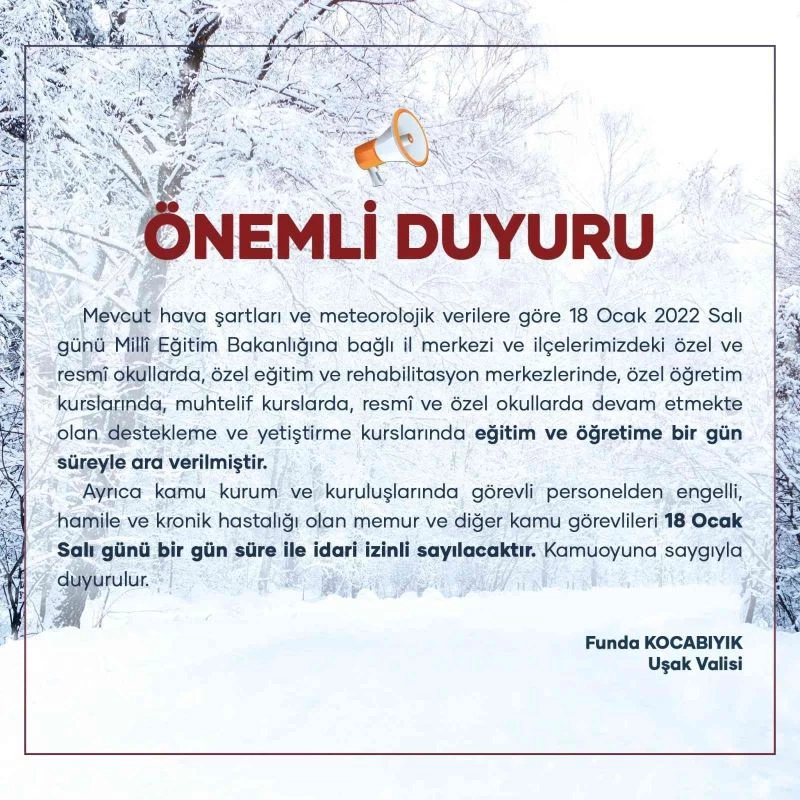 Uşak’ta gece geç saatlerde başlayan kar yağışı, sabaha karşı etkisini arttırdı. Yaklaşık 5 santimetreyi bulan kar yüksekliği nedeniyle Uşak Valiliği açıklamada bulundu. Yapılan resmi açıklamada, 18 Ocak 2022 günü mevcut hava şartları nedeniyle eğitim ve öğretime bir gün ara verdiği belirtildi. Ayrıca yapılan açıklamada kamu kurum ve kuruluşlarında görevli engelli, hamile ve kronik rahatsızlığı bulunan personelin de izinli olduğu belirtildi.