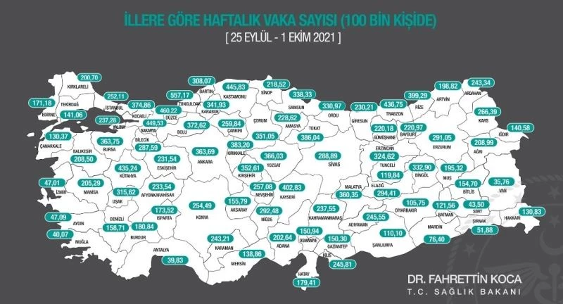 Bakan Koca, yaptığı açıklamada; "25 Eylül-1 Ekim arasında vaka yoğunluğu bir önceki haftaya göre en çok artan 10 ilimiz: Bursa, Balıkesir, Uşak, Kırklareli, Sakarya, Ardahan, Edirne, Mersin, Denizli, Samsun. Bu illerden birindeyseniz şimdi daha da dikkatli olmalısınız" dedi.