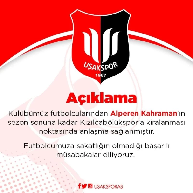 Uşakspor’un resmi sosyal medya hesabından yapılan açıklamada, 20 yaşındaki genç orta saha oyuncusu Alperen Kahraman’ın Kızılcabölükspor’a kiralanması konusunda anlaşmaya varıldığı belirtildi. Yapılan açıklamada, “Kulübümüzün futbolcularından Alperen Kahraman’ın sezon sonuna kadar Kızılcabölükspor’a kiralanması noktasında anlaşma sağlanmıştır. Futbolcumuza sakatlığın olmadığı başarılı müsabakalar diliyoruz” ifadeleri kullanıldı.