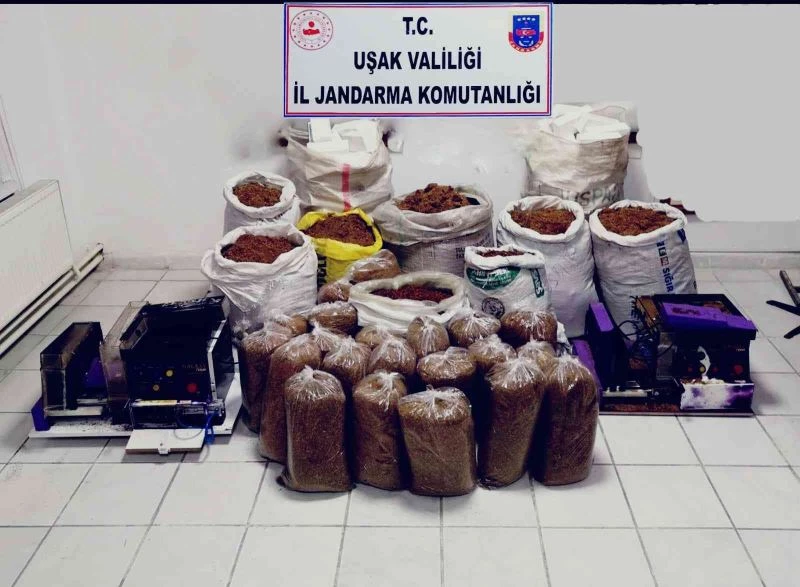 Uşak’ta jandarma ekiplerince bir evde yapılan aramada 310 kilograma yakın kaçak tütün ve 60 binden fazla makaron ele geçirildi.