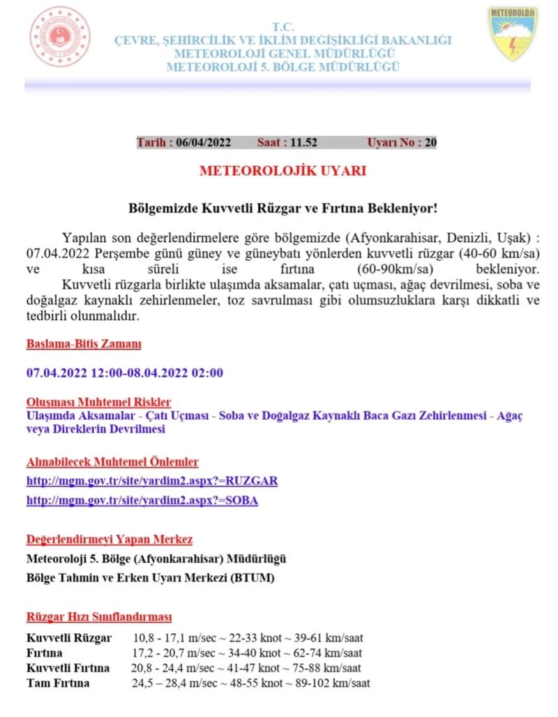 Çevre, Şehircilik ve İklim Değişikliği Bakanlığı Meteoroloji Genel Müdürlüğü Meteoroloji 5.Bölge Müdürlüğü, 7 Nisan Perşembe günü Uşak, Denizli ve Afyonkarahisar’da güney ve güney batı yönlerinde kuvvetli rüzgar ve fırtına beklendiğini belirtti. Ayrıca fırtına nedeniyle ulaşımda aksamalar, çatı uçması, ağaç devrilmesi, soba ve doğal gaz kaynaklı zehirlenmeler, toz savrulması gibi oluşabilecek olumsuzluklar durumunda da vatandaşlar uyarıldı.
