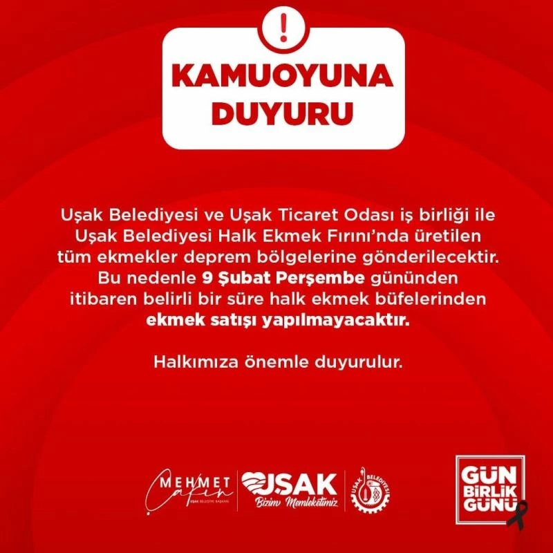 Uşak’ta 9 Şubat Perşembe günü itibariyle halk ekmek fırınlarında üretilen bütün ekmeklerin deprem bölgesine gönderileceği ve bu nedenle ekmek satışı yapılmayacağı duyuruldu.