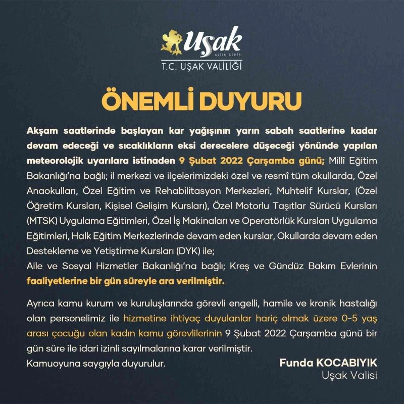 Uşak’ta akşam saatlerinde kar yağışı başladı. Kar yağışının yüksek kesimlerde etkisini arttırdığı ve yarın sabaha kadar devam edileceği, hava sıcaklığının da eksi derecelere düşeceği öğrenildi. Bunun üzerine harekete geçen Uşak Valiliği, okullara kar tatili verdi. Kar tatilini resmi sosyal medya hesabından açıklayan Vali Funda Kocabıyık, “Akşam saatlerinde başlayan kar yağışının yarın sabah saatlerine kadar devam edeceği ve sıcaklıkların eksi derecelere düşeceği yönünde yapılan meteorolojik uyarılara istinaden 9 Şubat 2022 Çarşamba günü; Milli Eğitim Bakanlığı’na bağlı; il merkezi ve ilçelerimizdeki özel ve resmi tüm okullarda, Özel Anaokulları, Özel Eğitim ve Rehabilitasyon Merkezleri, Muhtelif Kurslar, Özel Motorlu Taşıtlar Sürücü Kursları Uygulama Eğitimleri, Özel İş Makinaları ve Operatörlük Kursları Uygulama Eğitimleri, Halk Eğitim Merkezlerinde devam eden kurslar, Okullarda devam eden Destekleme ve Yetiştirme Kursları ile Aile ve Sosyal Hizmetler Bakanlığı’na bağlı Kreş ve Gündüz Bakım Evlerinin faaliyetlerine bir gün süreyle ara verilmiştir. Ayrıca kamu kurum ve kuruluşlarında görevli engelli, hamile ve kronik hastalığı olan personelimiz ile hizmetine ihtiyaç duyulanlar hariç olmak üzere 0-5 yaş arası çocuğu olan kadın kamu görevlilerinin 9 Şubat 2022 Çarşamba günü bir gün süre ile idari izinli sayılmalarını karar verilmiştir. Kamuoyuna saygıyla duyurulur” ifadelerine yer verildi.