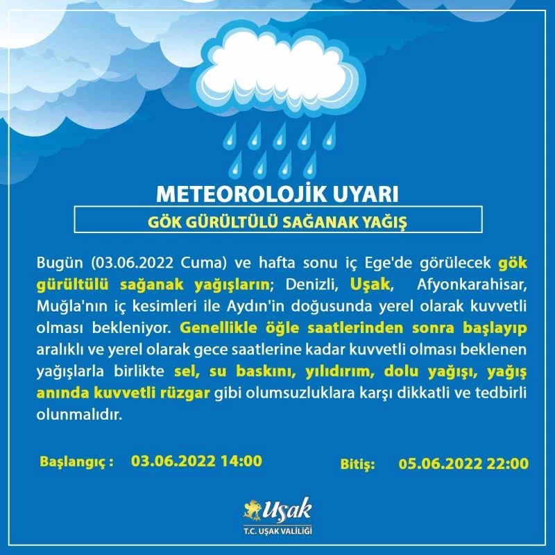 Meteoroloji 5. Bölge Müdürlüğü Uşak, Denizli, Afyonkarahisar, Muğla ve İç Ege’de kuvvetli yağış beklenmesinin ardından yazılı uyarıda bulunarak, “Yapılan son değerlendirmelere göre; 03 Haziran 2022 Cuma ve hafta sonu iç Ege’de görülecek gök gürültülü sağanak yağışların; Afyonkarahisar, Denizli ve Uşak’ta yerel olarak kuvvetli olması bekleniyor. Genellikle öğle saatlerinden sonra başlayıp aralıklı ve yerel olarak gece saatlerine kadar kuvvetli olması beklenen yağışlarla birlikte sel, su baskını, yıldırım, dolu yağışı, yağış anında kuvvetli rüzgar gibi olumsuzluklara karşı dikkatli ve tedbirli olunmalıdır” vatandaşları muhtemel olumsuzluklara karşı hazır olmaları konusunda uyardı.