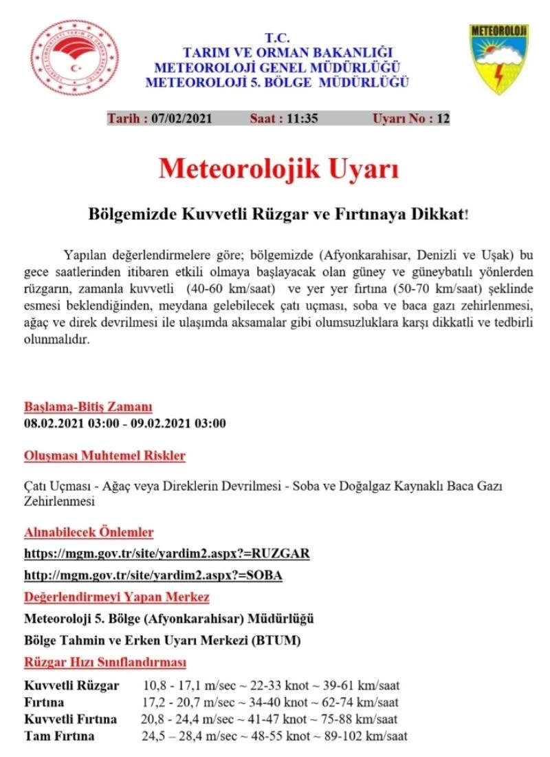 Tarım ve Orman Bakanlığı Meteoroloji Genel Müdürlüğü tarafından yapılan açıklamaya göre Uşak, Denizli ve Afyonkarahisar’da 08.02.2021-09.02.2021 tarihleri arasında kuvvetli rüzgar ve fırtına beklendiği bildirilirken vatandaşlar oluşabilecek olumsuzluklara karşı uyarıldı.
