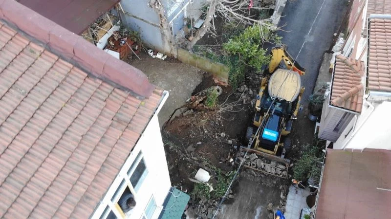 Yağmura dayanamaması sebebiyle çöken istinat duvarı dron ile havadan görüntülendi.