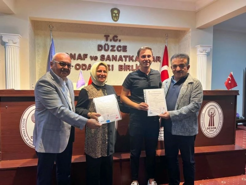Düzce’de pimapen ustaları ve emlakçılar için açılan mesleki Yeterlilik Kursunu başarı ile bitiren ustalar DESOB’ta düzenlenen törenle belgelerini aldı.