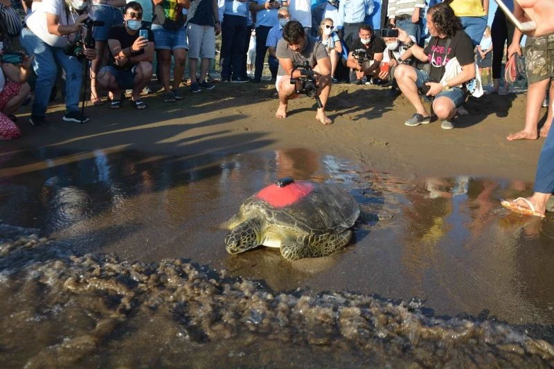 Uydu takip cihazı takılan yeşil deniz kaplumbağası denize bırakıldı