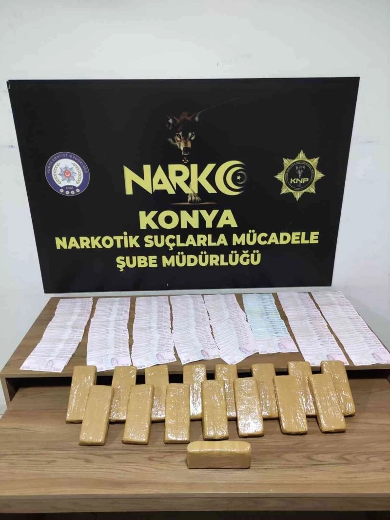 Konya İl Emniyet Müdürlüğü Narkotik Suçlarla Mücadele Şube Müdürlüğü ekipleri, Konya’ya uyuşturucu getiren ve piyasaya uyuşturucu süren kanalların tespitine yönelik çalışmalarına devam ediyor. Konya Polisinin "Kökünü Kurutma" operasyonları çerçevesinde şüphe üzerine bir araç takibe alındı. Karatay ilçesi Fetih Mahallesinde bir adrese giden şahıs başka bir kişiyle buluşarak uyuşturucu alışverişi yaptığı esnada narkotik ekipleri baskın yaptı. Ekipleri gören şahıslar kaçmaya başlarken, kısa süreli kovalamacanın ardından yakalanarak gözaltına alındı. Şahısların aracında yapılan aramada 16 parça halinde 8 kilo 60 gram eroin maddesi, 69 bin 400 TL ve 800 dolar şüpheli para ele geçirilerek el konulurken, 2 kişi gözaltına alındı. Uyuşturucu Madde Ticareti Yapmak/Nakletmek ve Kullanmak suçlarından gözaltına alınan Abdülazim Y. ve Cebrail D. emniyetteki işlemlerinin tamamlanmasının ardından sevk edildiği adli makamlarca tutuklanarak cezaevine gönderildi.