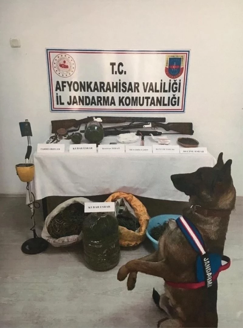 Olay, Bolvadin ilçesi Özburun beldesinde meydana geldi. Edinilen bilgilere göre, belde M.K. ve M.G. isimli şahısların uyuşturucu madde imal ederek sattıkları bilgisini alan ekipler harekete geçerek şüphelilerin kaldığı adrese baskın düzenledi. Yapılan aramada 21 adet tarihi eser niteliği taşıyan obje, 11 bin 300 gr kubar esrar, 496 gr reçine esrar, 9 gr kenevir tohumu, 6 gr metamfetamin, 3 adet ruhsatsız av tüfeği ve 1 adet dedektör ele geçirildi.