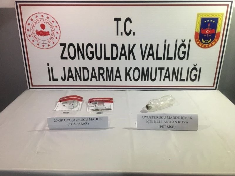 Edinilen bilgiye göre, Zonguldak İl Jandarma Komutanlığı ekiplerince yapılan istihbarı çalışmalar neticesinde; Zonguldak’ın Devrek İlçesi Kekeler köyünde uyuşturucu kullandığı bilgisi alan ekipler operasyon düzenledi. A.E., K.Ö. ve G.T. isimli şahısların uyuşturucu kullandığı bilgisi alınması üzerine operasyon düzenledi. Zonguldak’ın Devrek İlçesi Kekeler köyünde araçta yapılan aramada 20 gram Toz Esrar ve uyuşturucu içme aparatı ile birlikte yakalanarak gözaltına alındı.