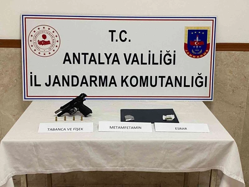Edinilen bilgiye göre, Manavgat İlçe Jandarma Komutanlığı Kaçakçılık ve Organize Suçlarla Mücadele (KOM) ekipleri, uyuşturucu madde kullandığı bilgisi alınan A.B. isimli şahsı Sanayi Mahallesi’nde düzenlenen operasyonla yakaladı. Şüpheli şahsın yapılan üst aramasında; 1,2 gram metamfetamin uyuşturucu maddesi, 8 gram esrar uyuşturucu maddesi, 1 adet tabanca ve 4 adet tabancaya ait fişek ele geçirildi.